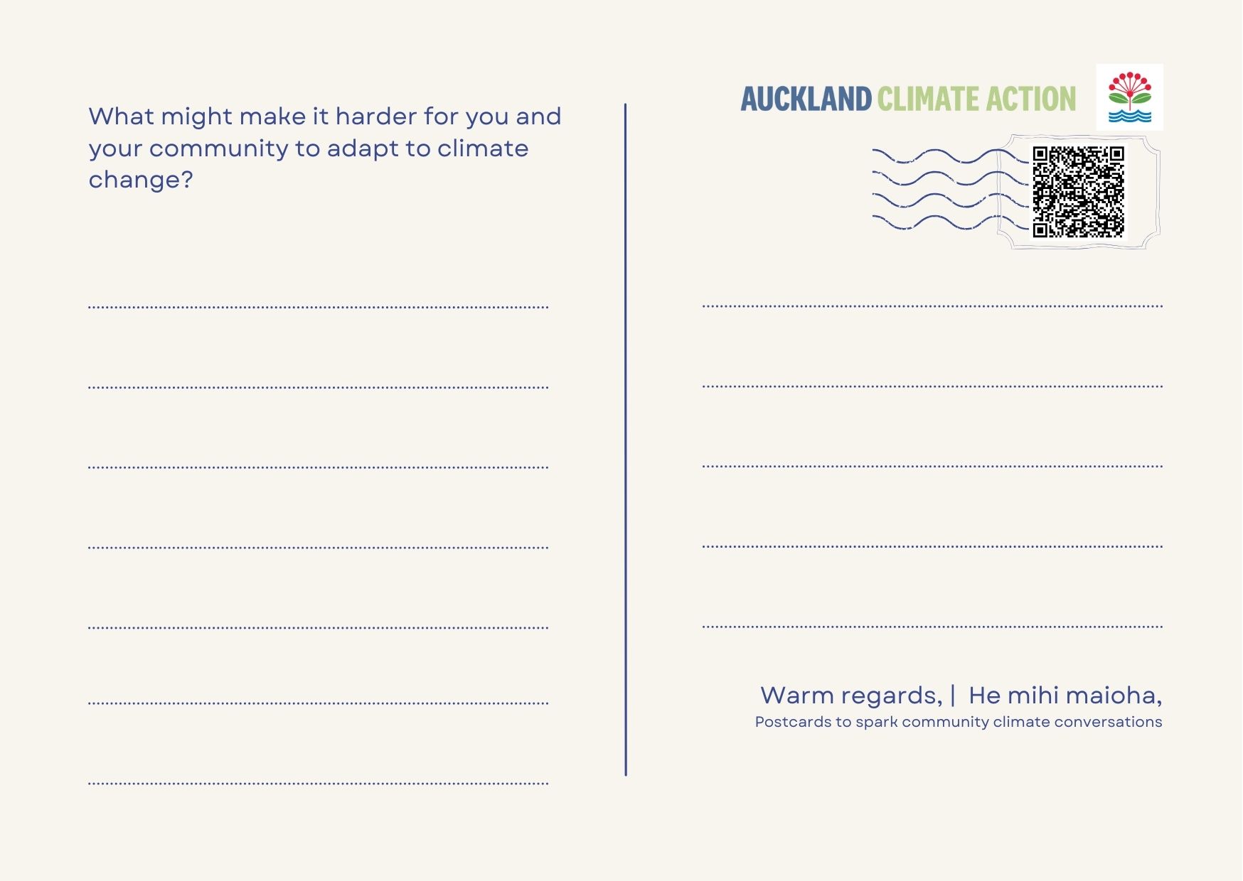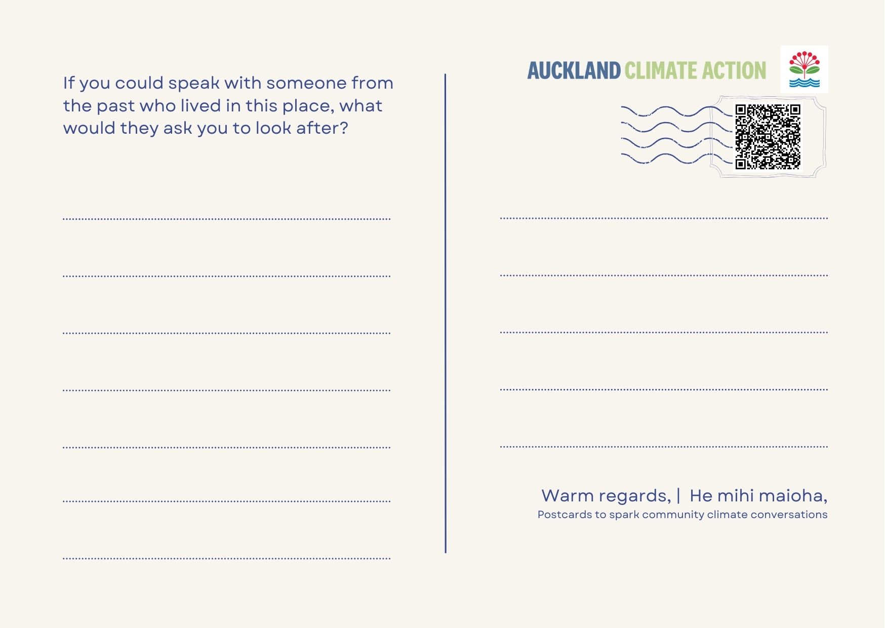 You might use the postcards by sharing them out among neighbours, whānau or with your community members. You could invite people to sit with a question, jot down their thoughts, and "post" their cards back in a collective kete. Gathering responses might help you notice the patterns, values and hopes of your community that surface. These postcards work just as well virtually or in real life, and we’ve included print-ready files if you’d like to print your own and place them on work tables, noticeboards, or in shared space.