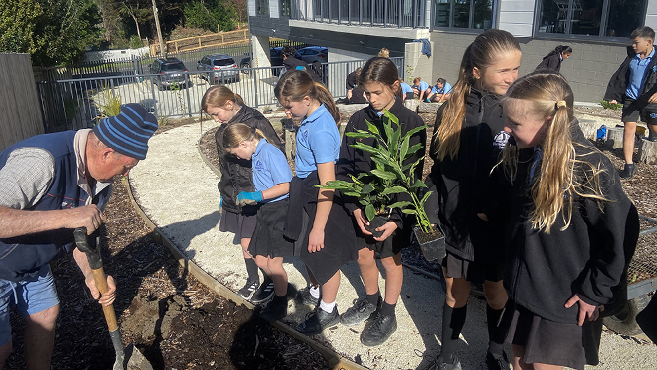 “I said go and do the research, draw the design, so they did a digital design on Google Drawings, and then I said you can do the costings now. We want mostly native plants, so off you go, start looking stuff up.” Jane Suckling