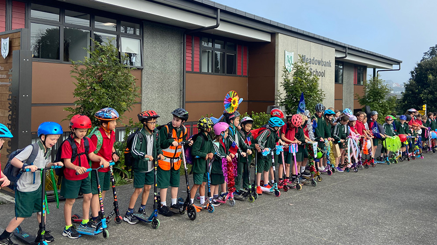 In response, the enviro group designed a campaign, with support from AT (Auckland Transport) and Sustainable Schools, to encourage students and whānau to swap out car trips for active transport trips. The fortnight-long festival included a myriad of activities, such as Glam Your Wheels Monday (celebrating scooters and bikes), Wear What Ya Want Walking Wednesday (mufti day for walkers) and Feel Good Friday (encouraging walking to school with friends).