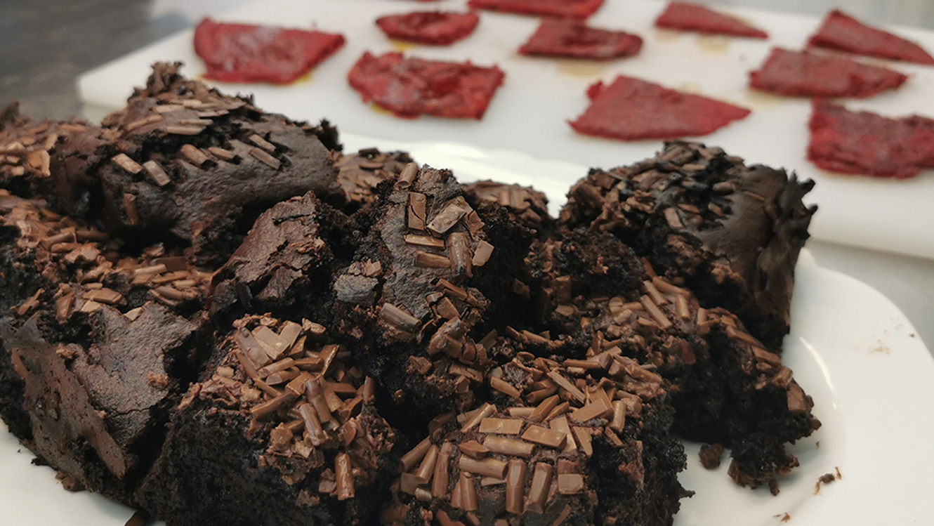 “We started with baking and meatier recipes. So we made beetroot brownies and pancakes, and we snuck the leafy greens into sausage rolls and cream cheese pastry puffs. I also taught the students to clean, chop and freeze the greens to use at a later date, as a commercial kitchen would do.”